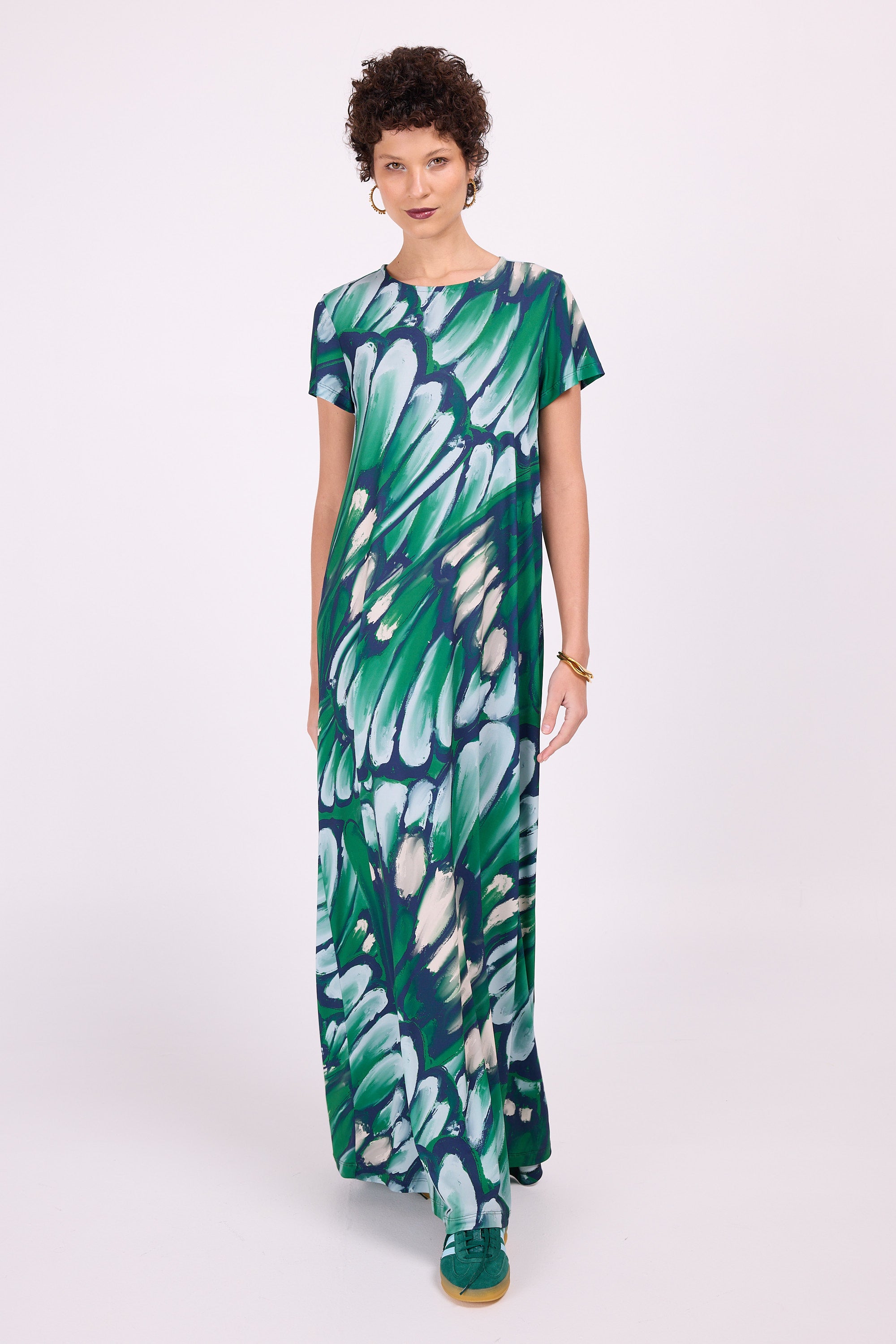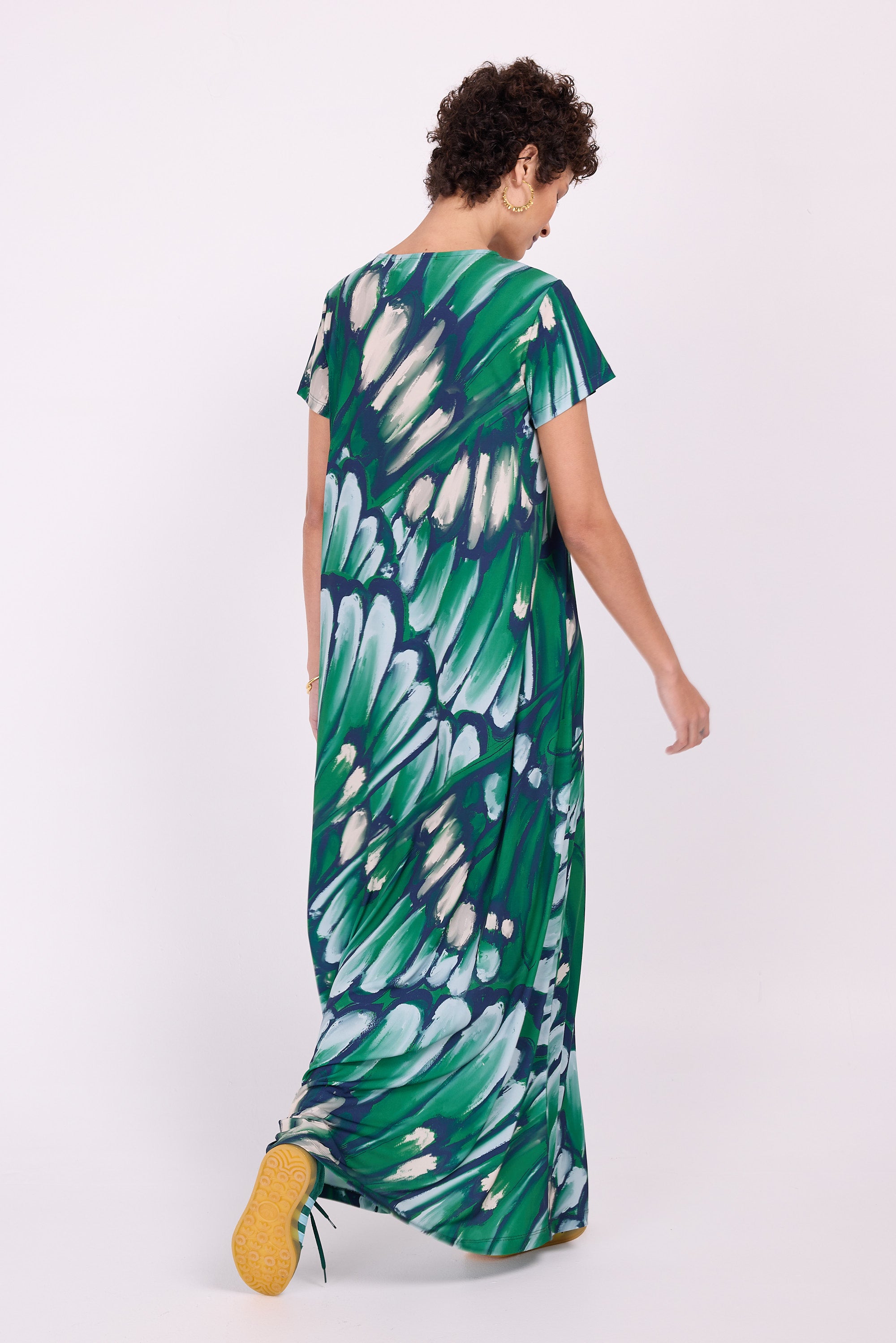 Lange jurk met hooggesloten hals, passend bovenaan, maar met groot volume in de rok. Ciska is een prachtig canvas voor de weelderige nachtvlinderprint in blauw- en groentinten.