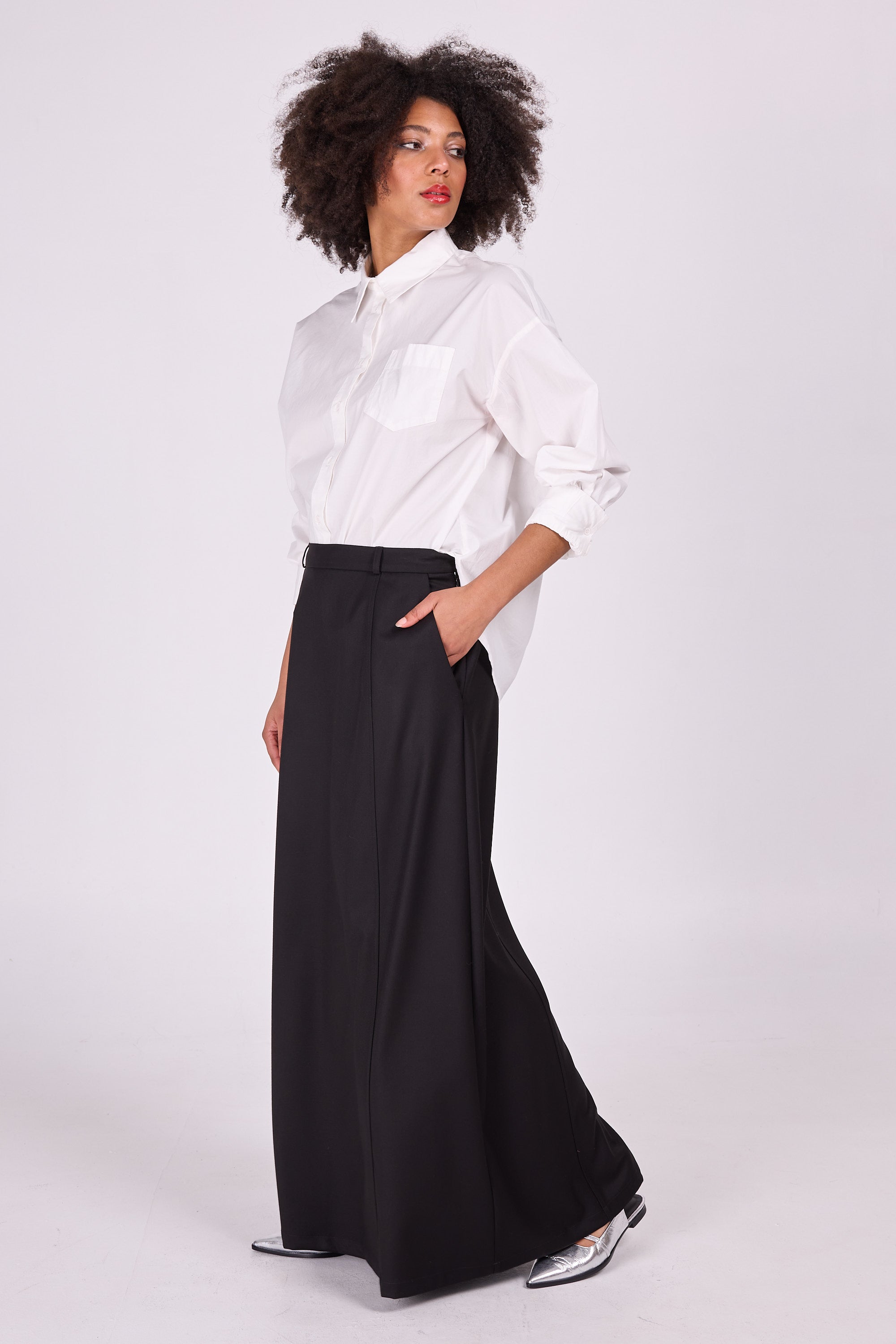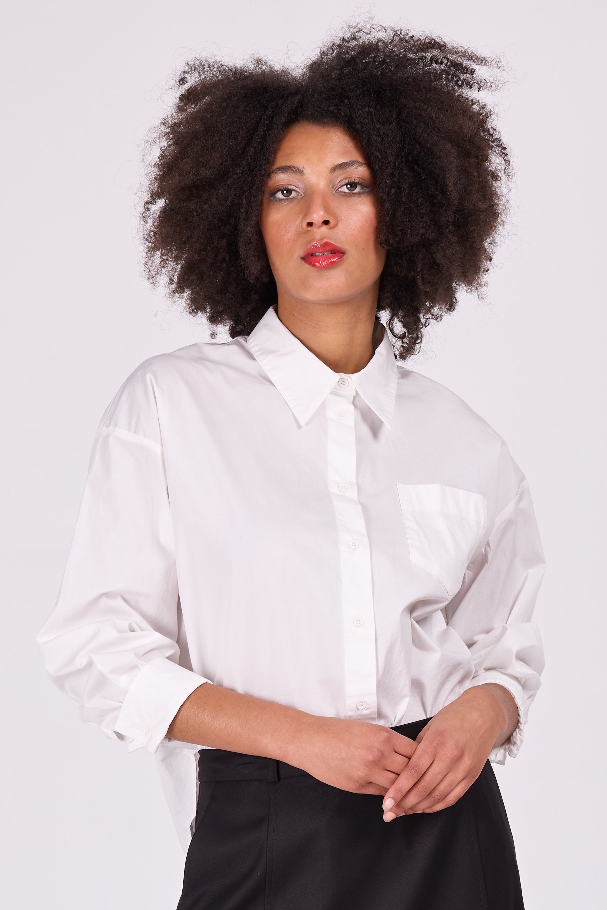 Breedvallend hemd met afhangende schouder, pofmouwen en fronsing op de rug. Gemaakt in luchtige stretchkatoen popeline.