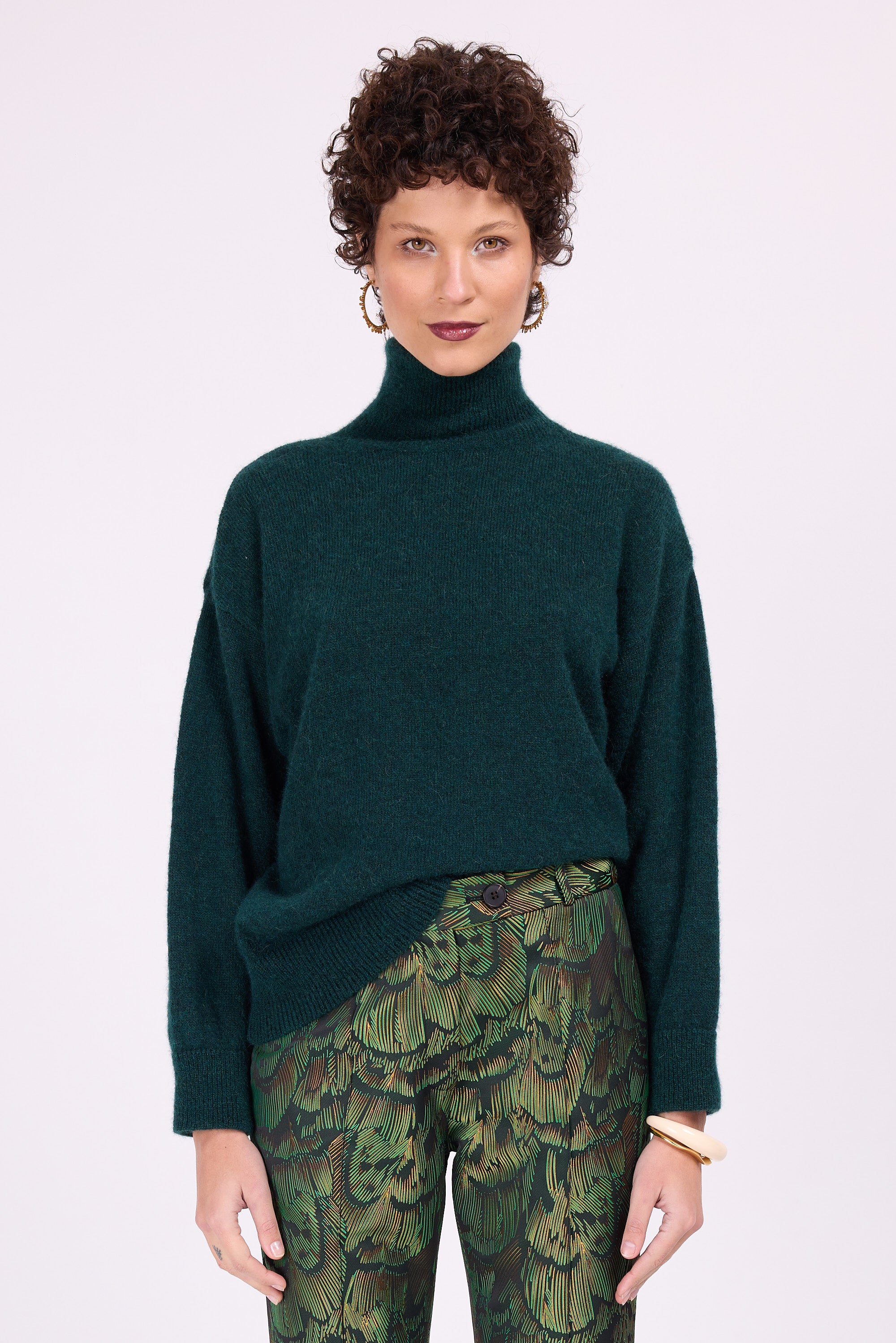 Losvallende trui met opstaande kraag in alpaca wolmix, gebreid in België. Nonchalant, stoer en bijzonder aangenaam om te dragen.