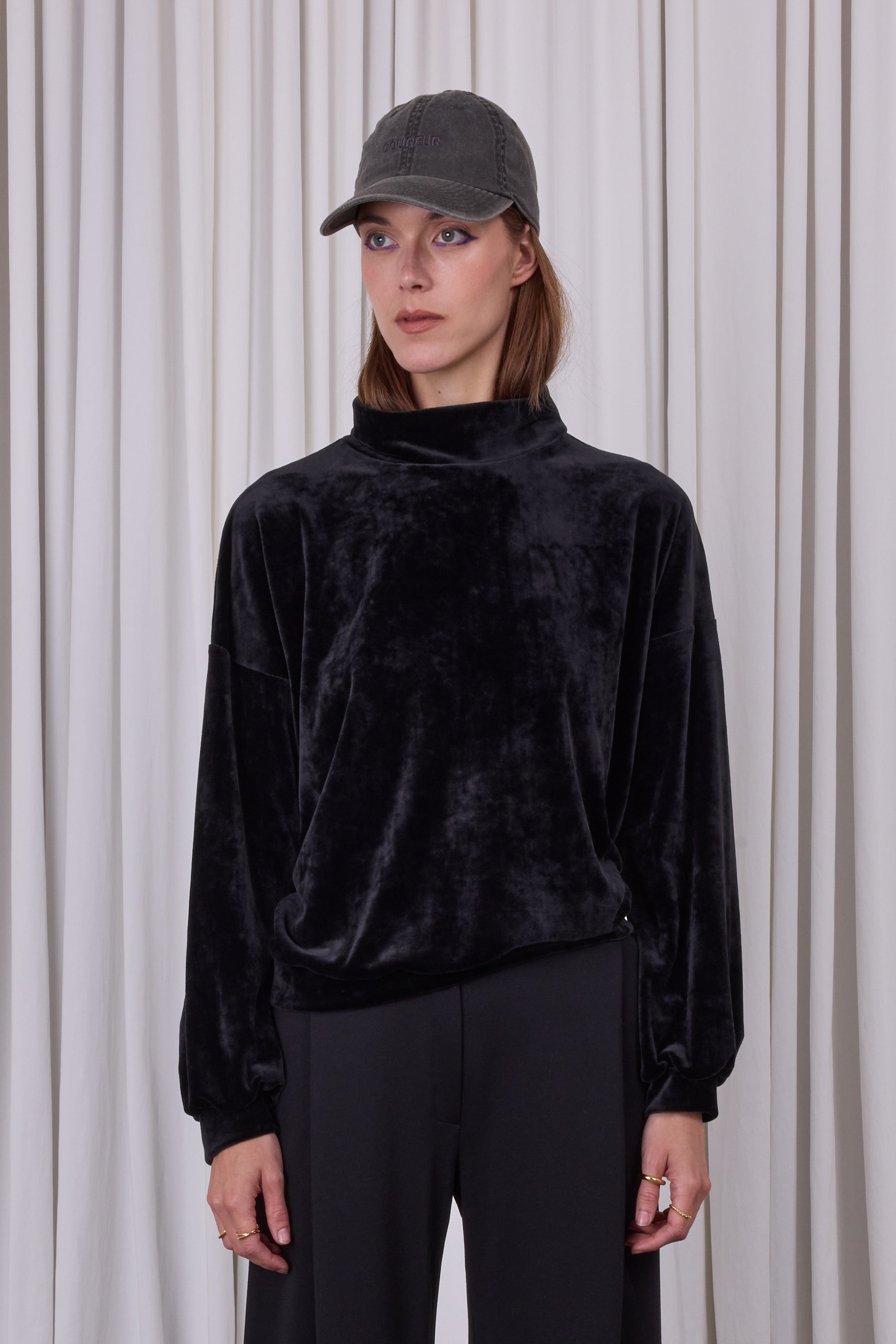 Sportieve sweater met afhangende schouders en opstaande kraag. Gezellig om dragen en veelzijdig te combineren!
