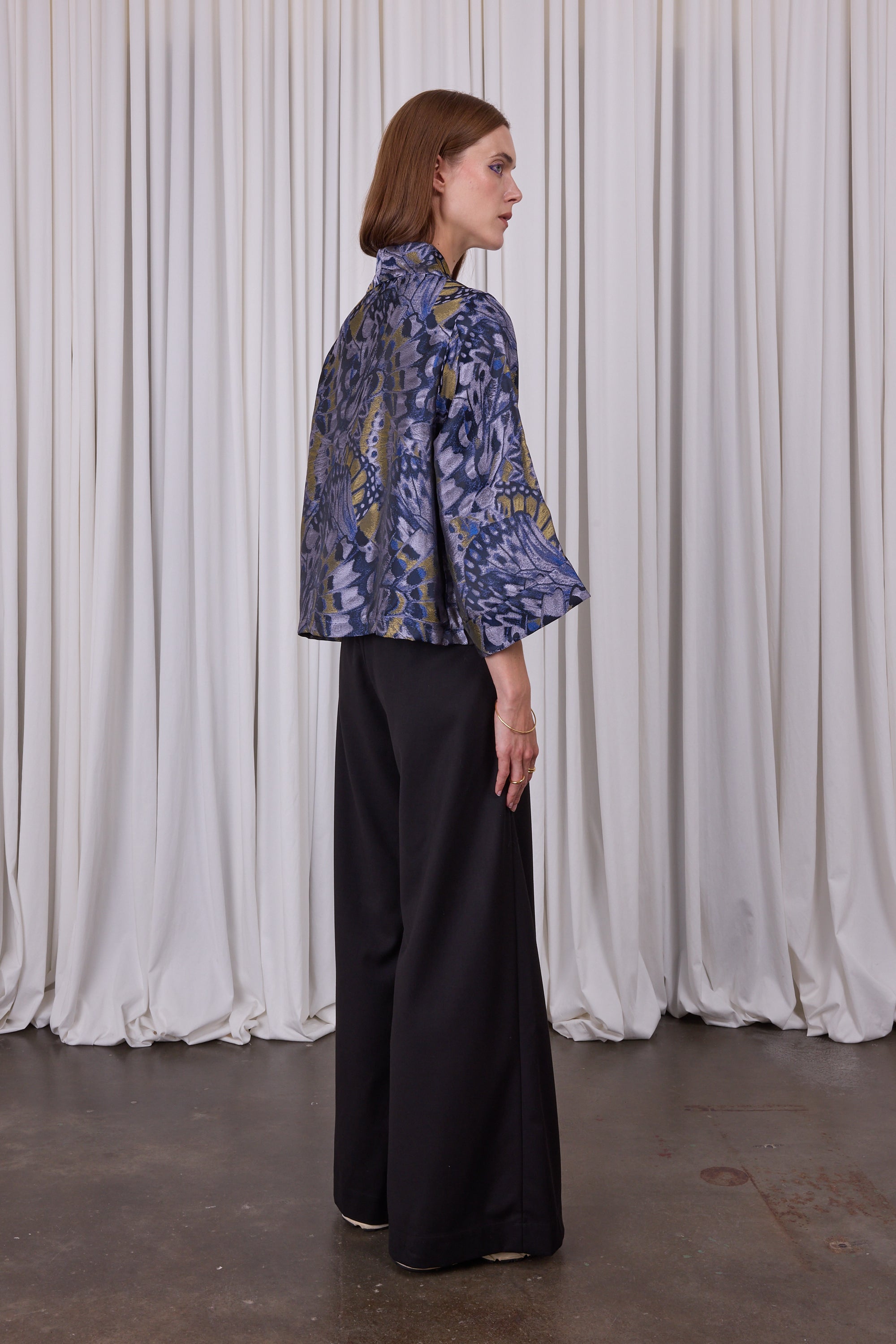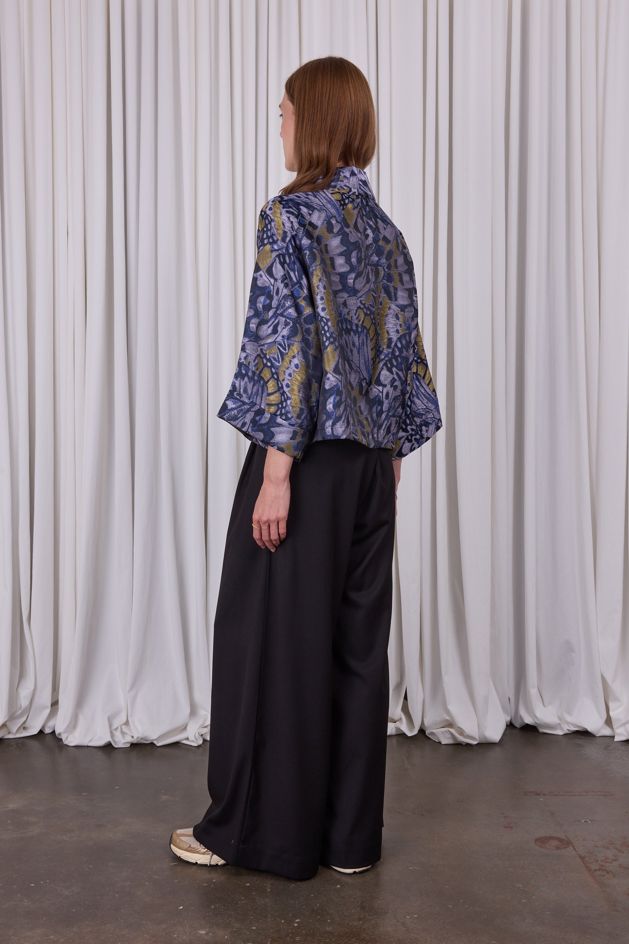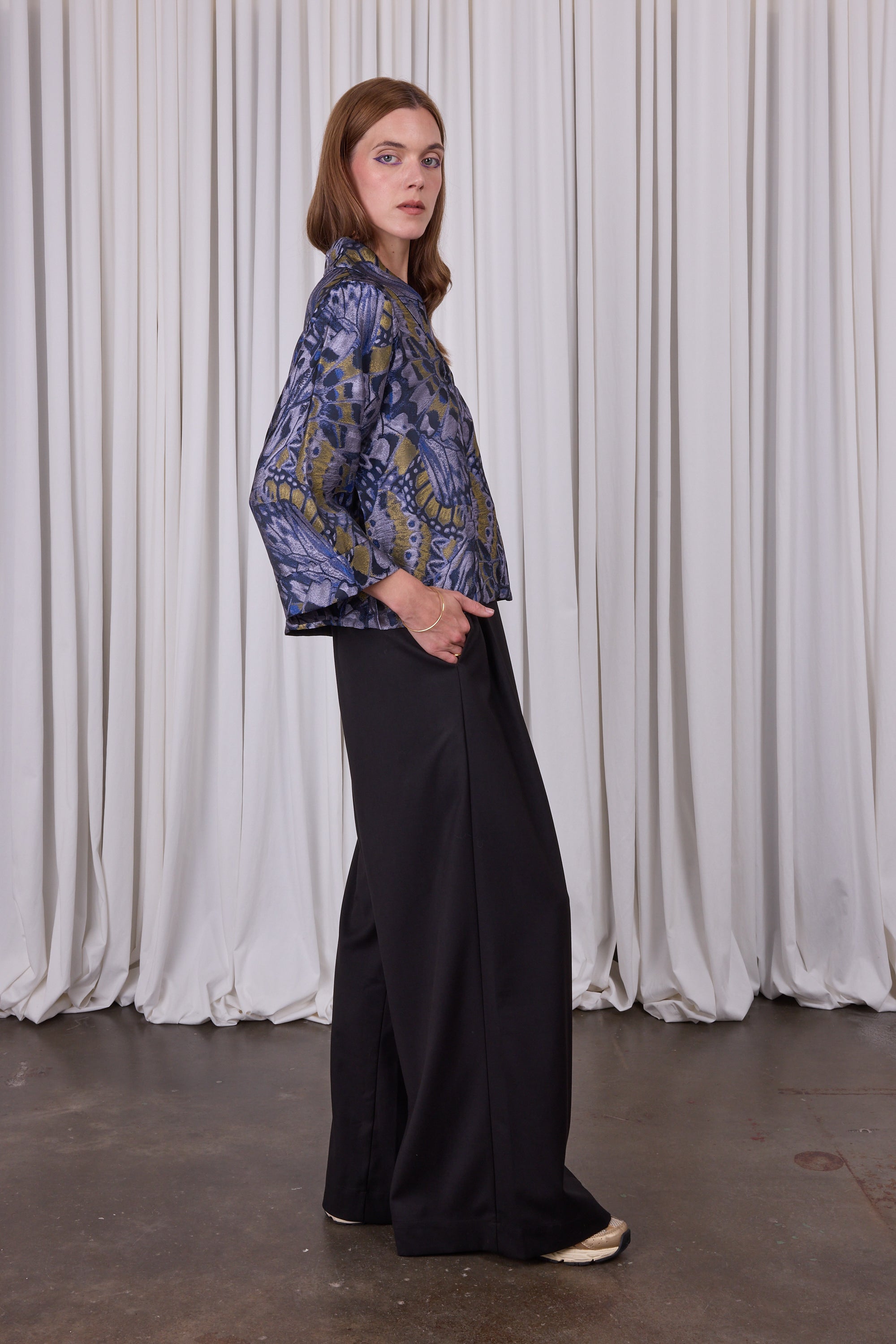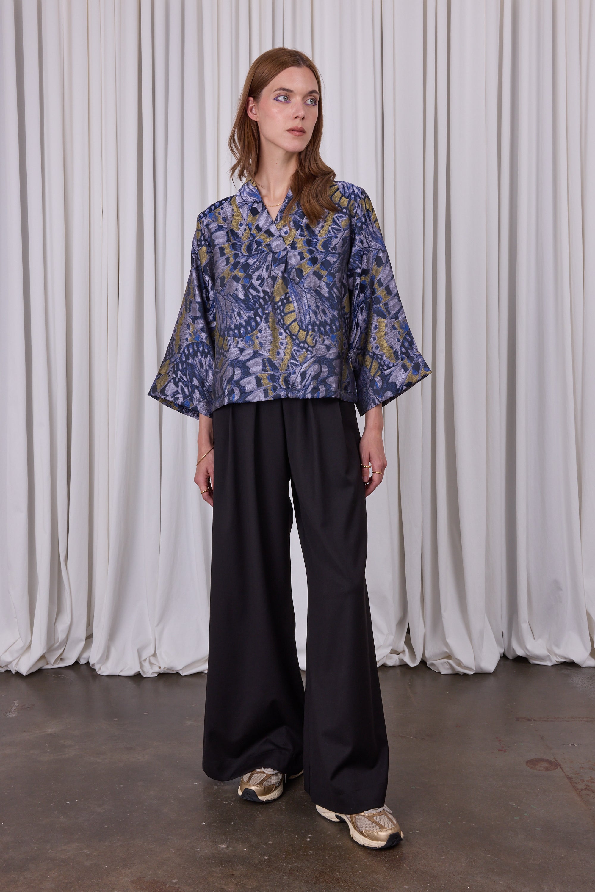 Volumineuze broek in soepele stof, waardoor het bijna een broekrok lijkt. De brede riemlitsen vormen één lijn met de plooien op de pijp. Combineer met top Camille in dezelfde stof met subtiele glans voor een monochrome 'total look'.