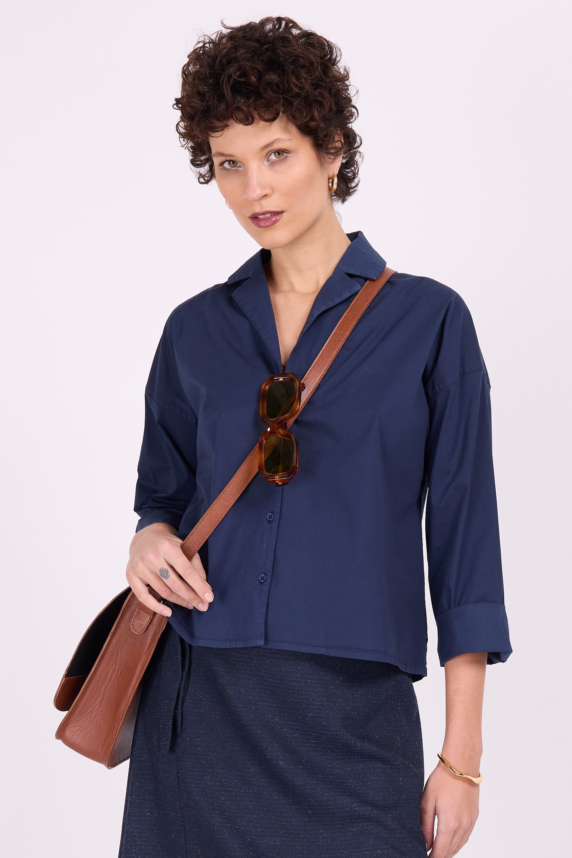 Erg geliefd in de vorige wintercollectie en nu terug in fijne stretchkatoen popeline. Gekleed hemd met openvallende kraag, brede mouw met omslag en lichtjes getailleerd. Je kan Carol ook los dragen als luchtig extra laagje.