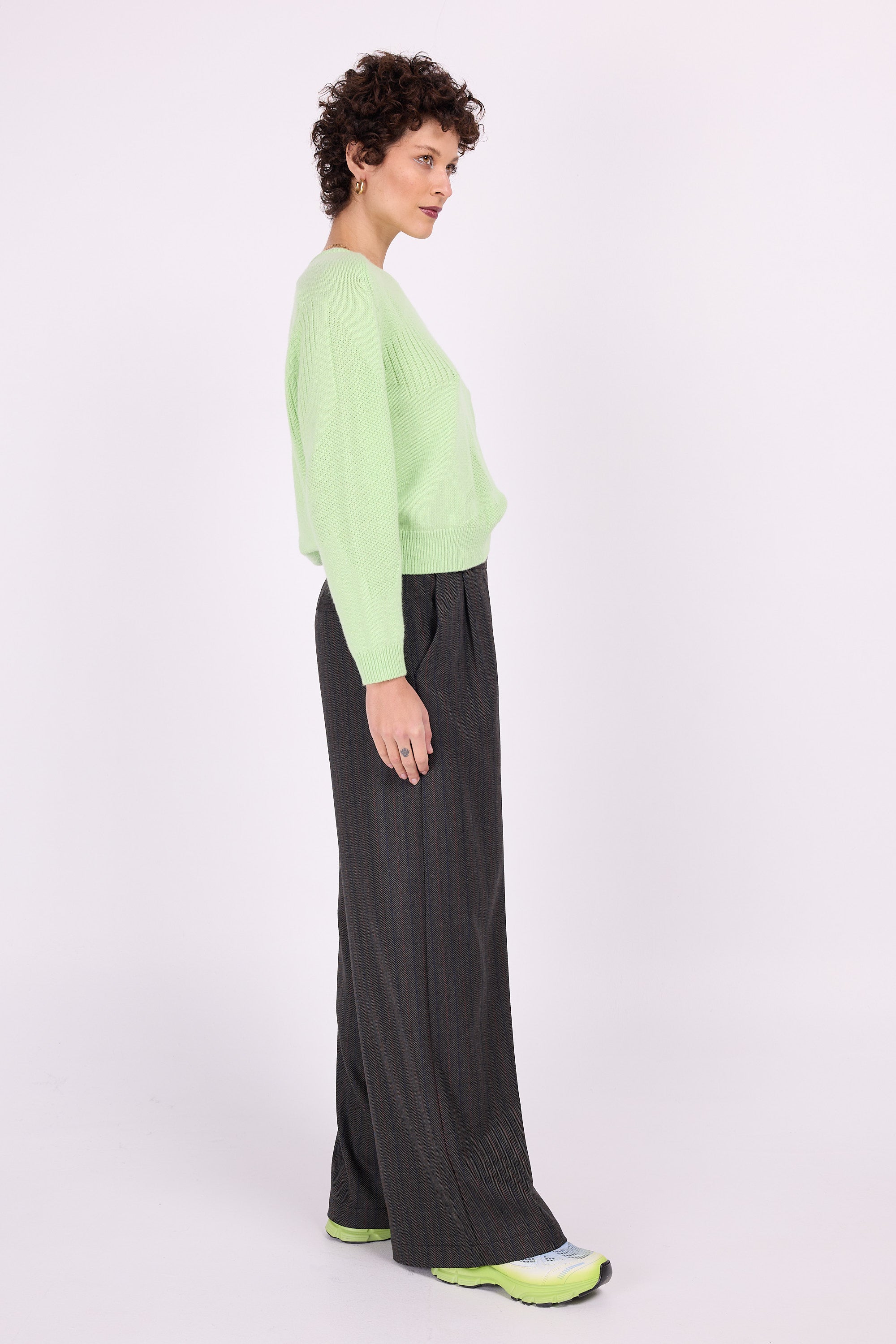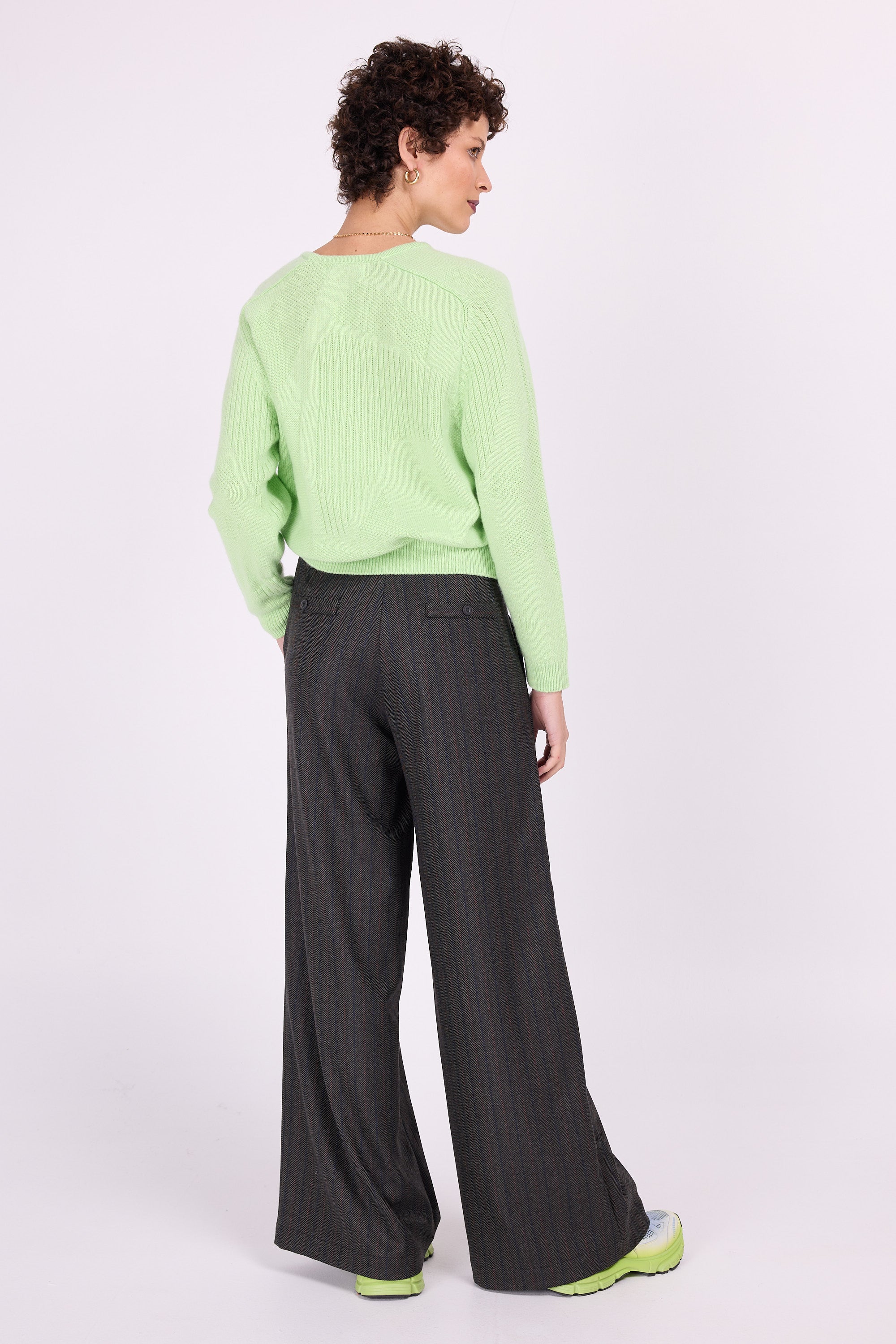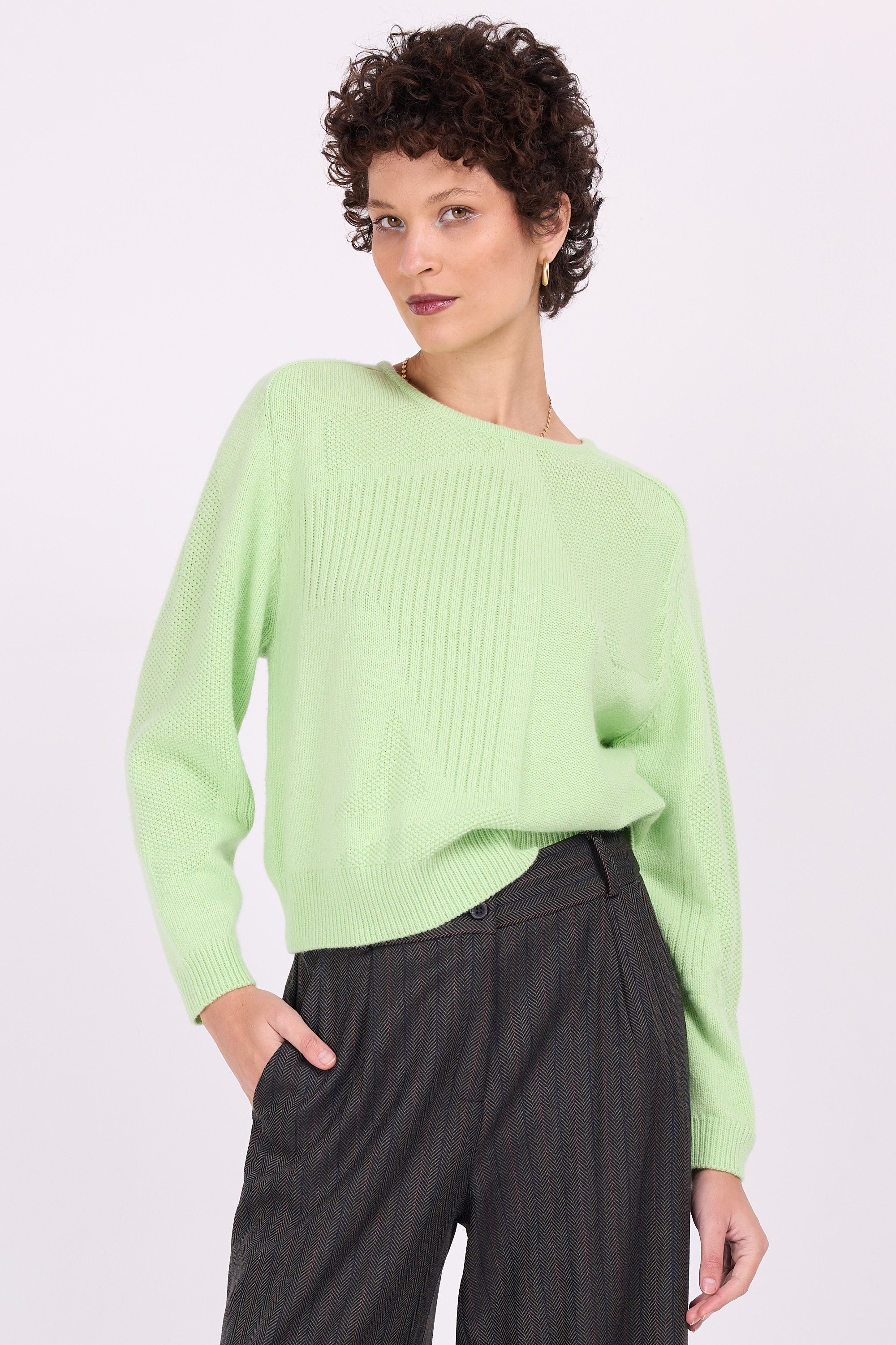 Maputo is enig in zijn soort: de grafische tekening in verschillende ajoursteken maakt hem origineel, maar toch veelzijdig draagbaar omdat er slechts één kleur garen gebruikt werd. De trui is gebreid in merinowol-kasjmier mix, heerlijk zacht op de huid.