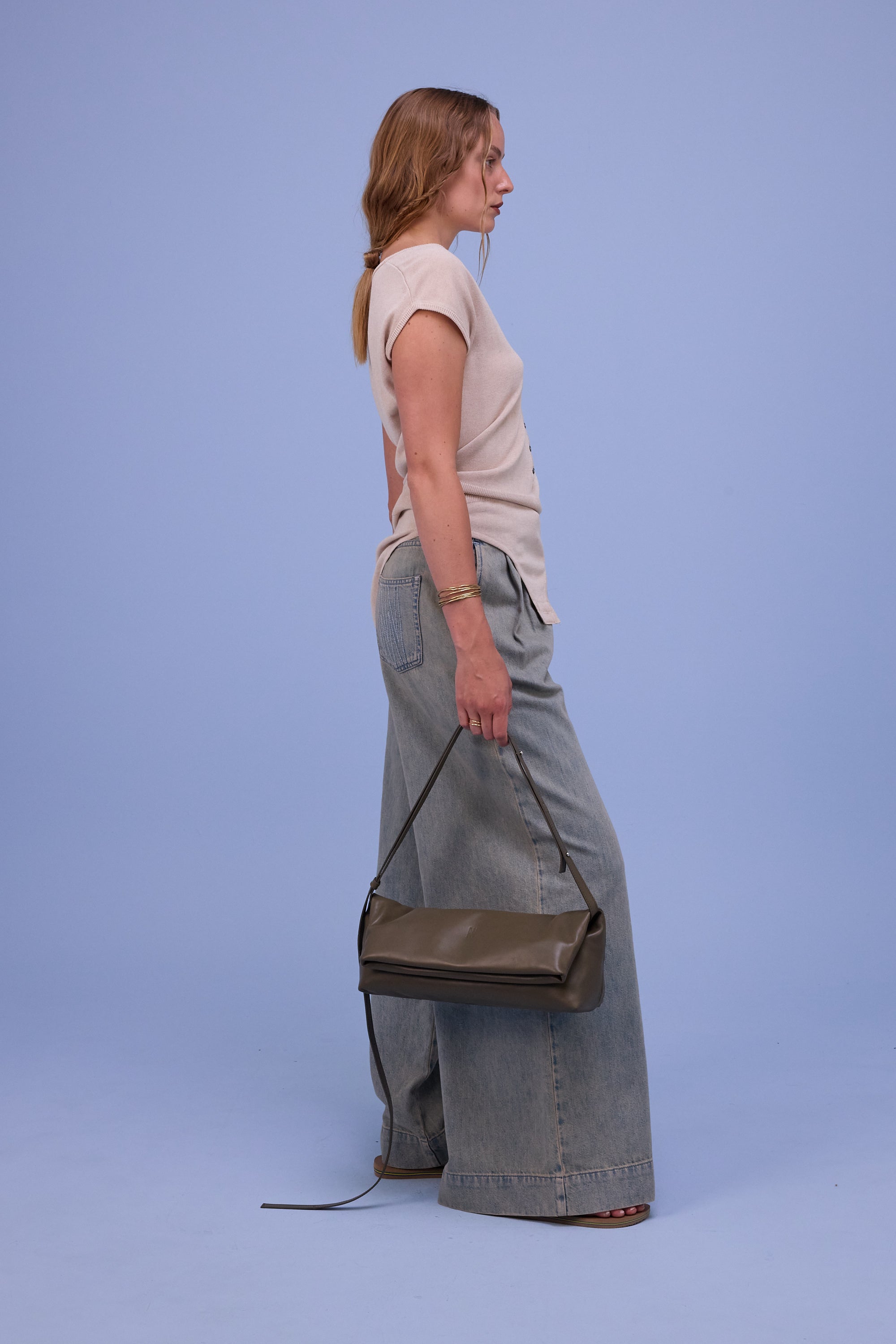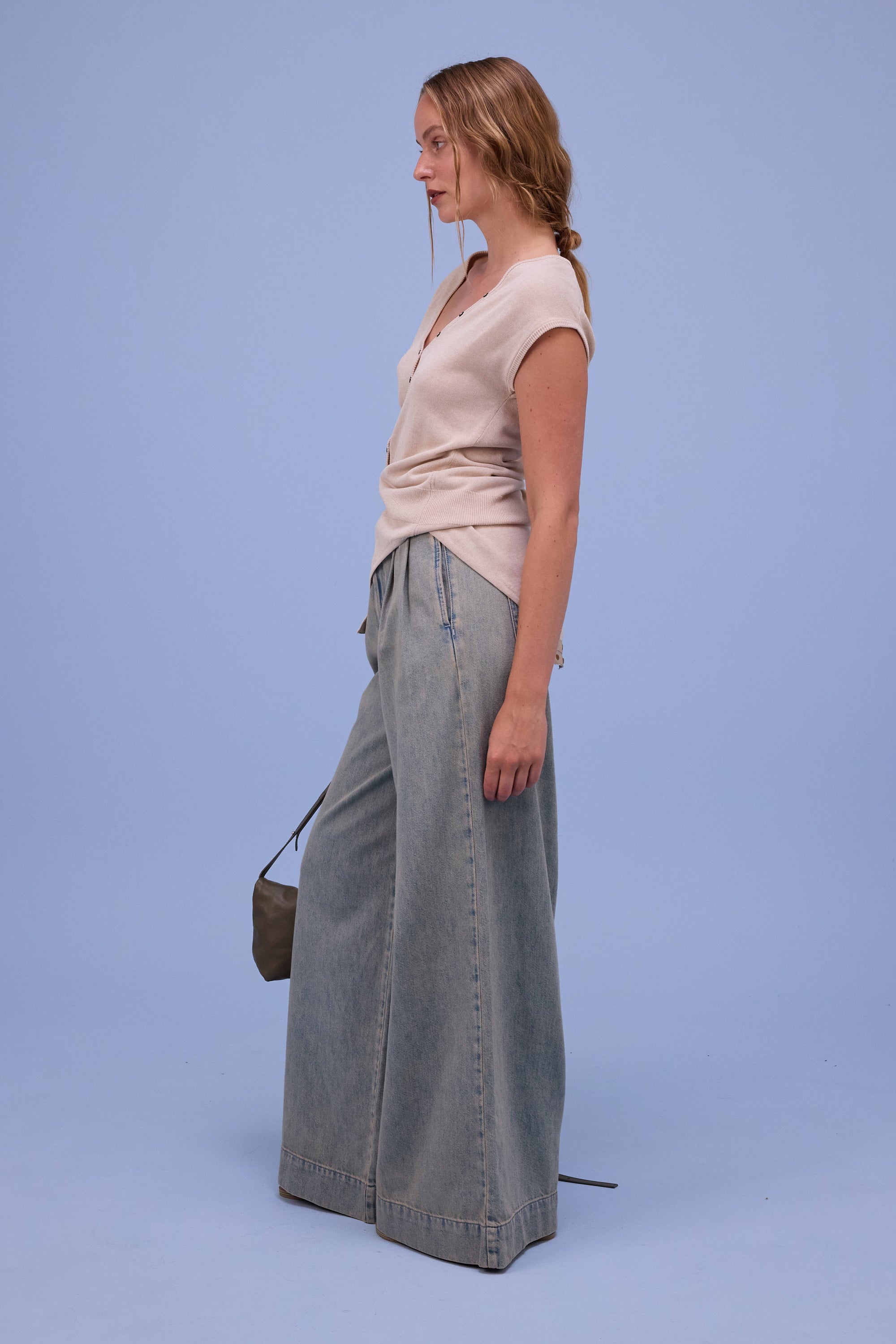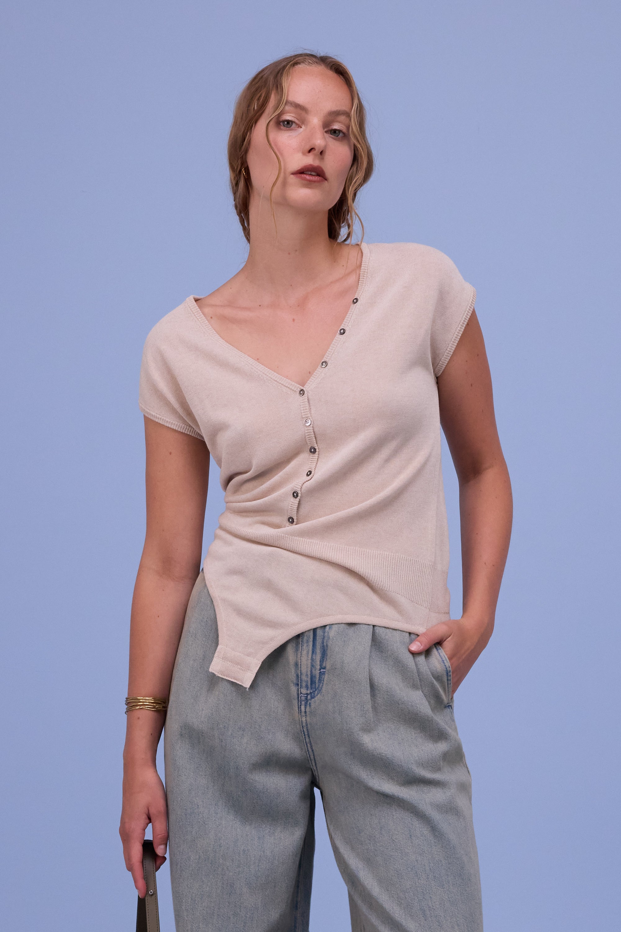 Hommage is een echte eyecatcher. Deze body is gebreid in een viscose blend met katoen en merinowol. Dankzij de natuurlijke eigenschappen van de garens voelt het ademend aan en reguleert het de temperatuur, waardoor het zowel bij mild als wat koeler weer prettig te dragen is. Het decolleté is aanpasbaar met fijne parelmoerknoopjes, maar intrinsiek wat dieper uitgesneden. Het perfecte stuk bij een geklede hoge taille broek of juist een interessante clash bij een casual jeans.