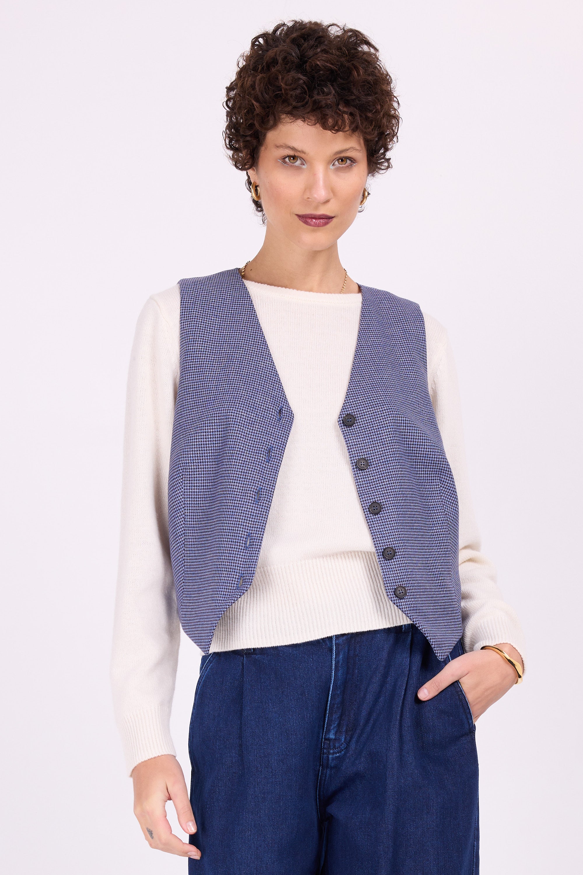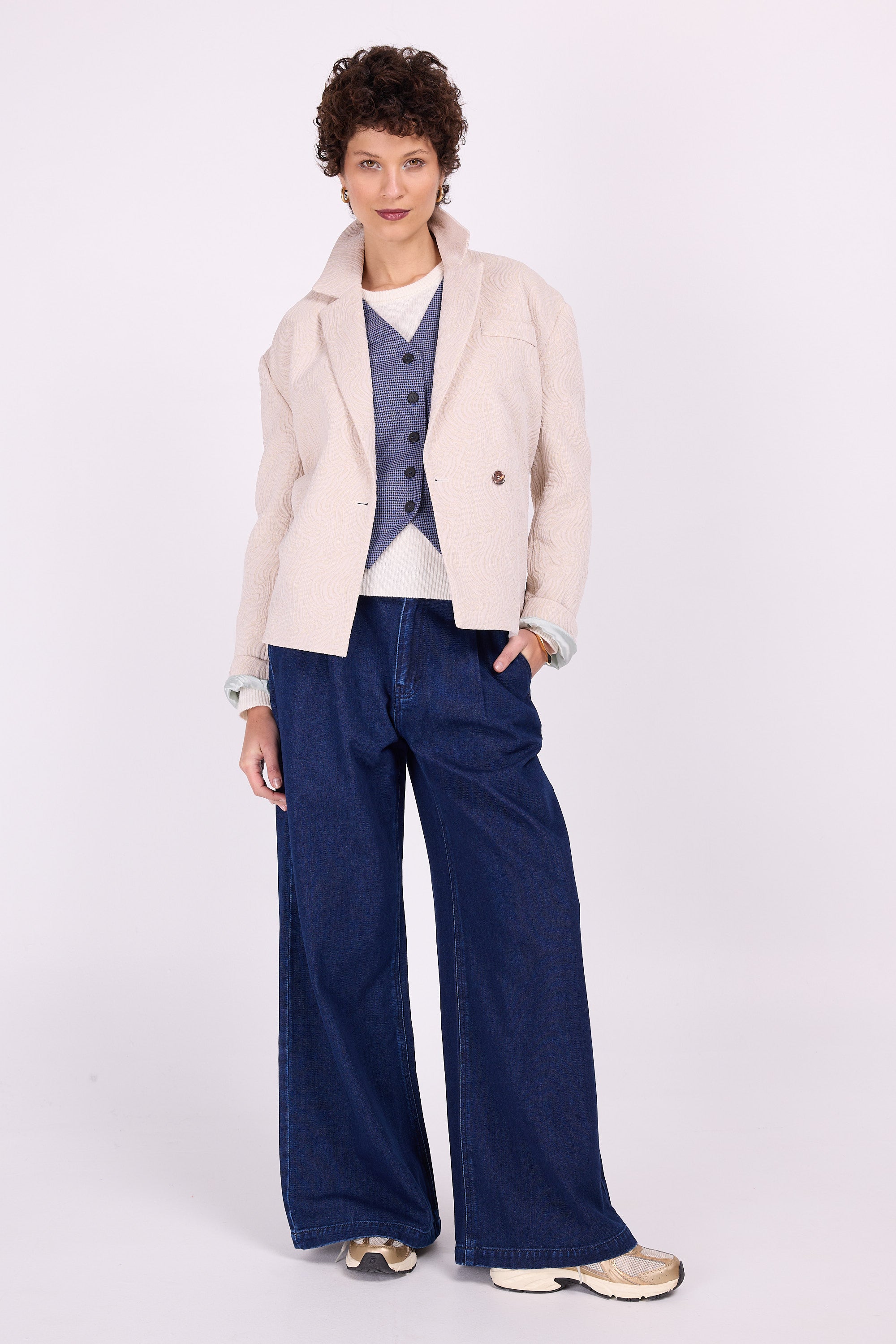 Overgenomen uit de mannenmode, maar oh zo krachtig in een vrouwelijk silhouet. Draag het schijnbaar nonchalant over een fijngebreide trui of maak je de look geheel eigen door het gesloten op je blote huid te dragen in combinatie met de kostuumbroek in dezelfde stof.