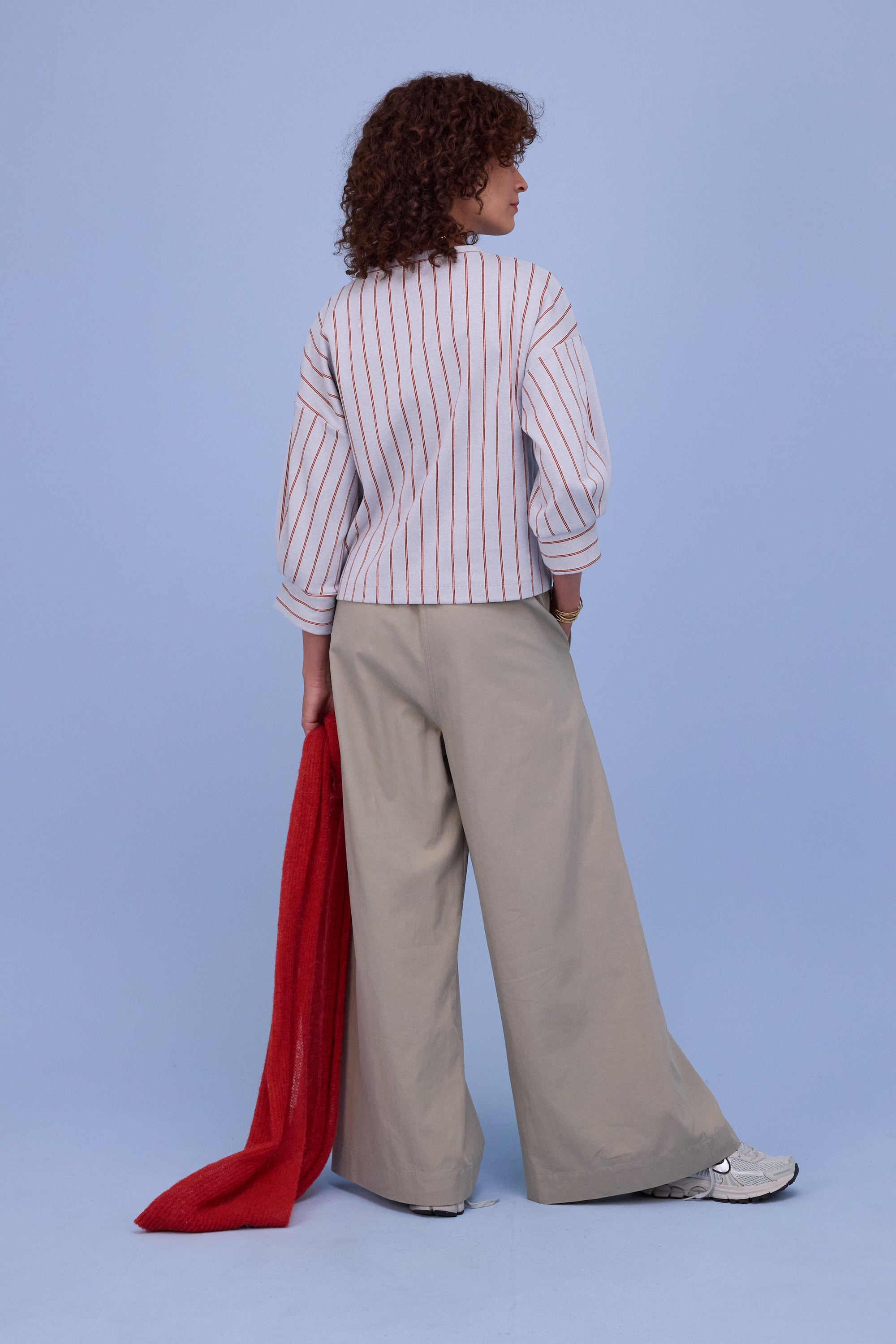 La version la plus spéciale de cette saison est en jersey jacquard rayé : un fond bleu clair avec de fines doubles rayures verticales rouges.