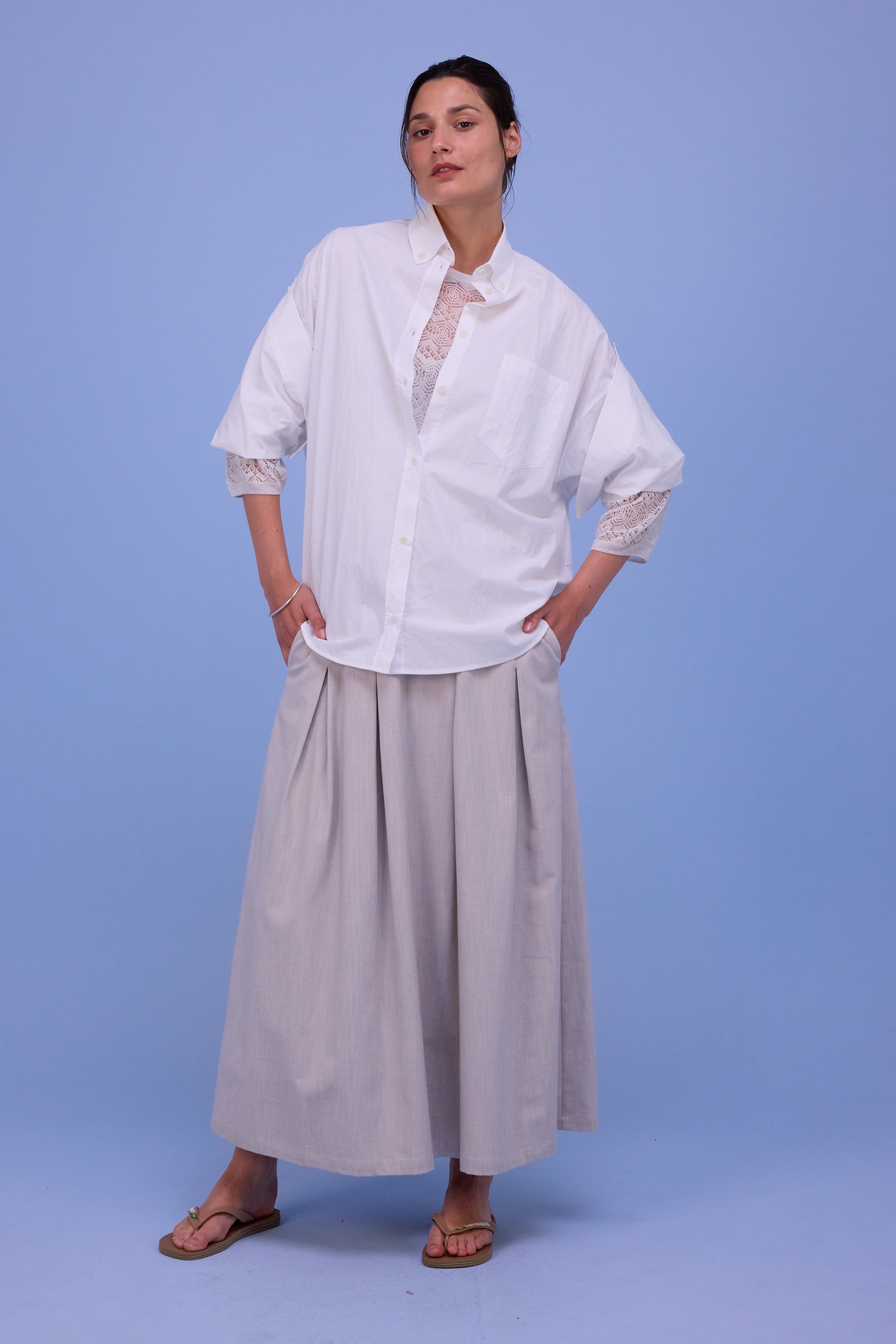 Jupe longue volumineuse avec plis et large ceinture élastique. Épuisée rapidement l'été dernier, elle revient maintenant dans d'autres tissus pour la nouvelle saison. Réalisée en twill bicolore : un mélange de coton avec des mouchetures blanches et un effet de lignes.