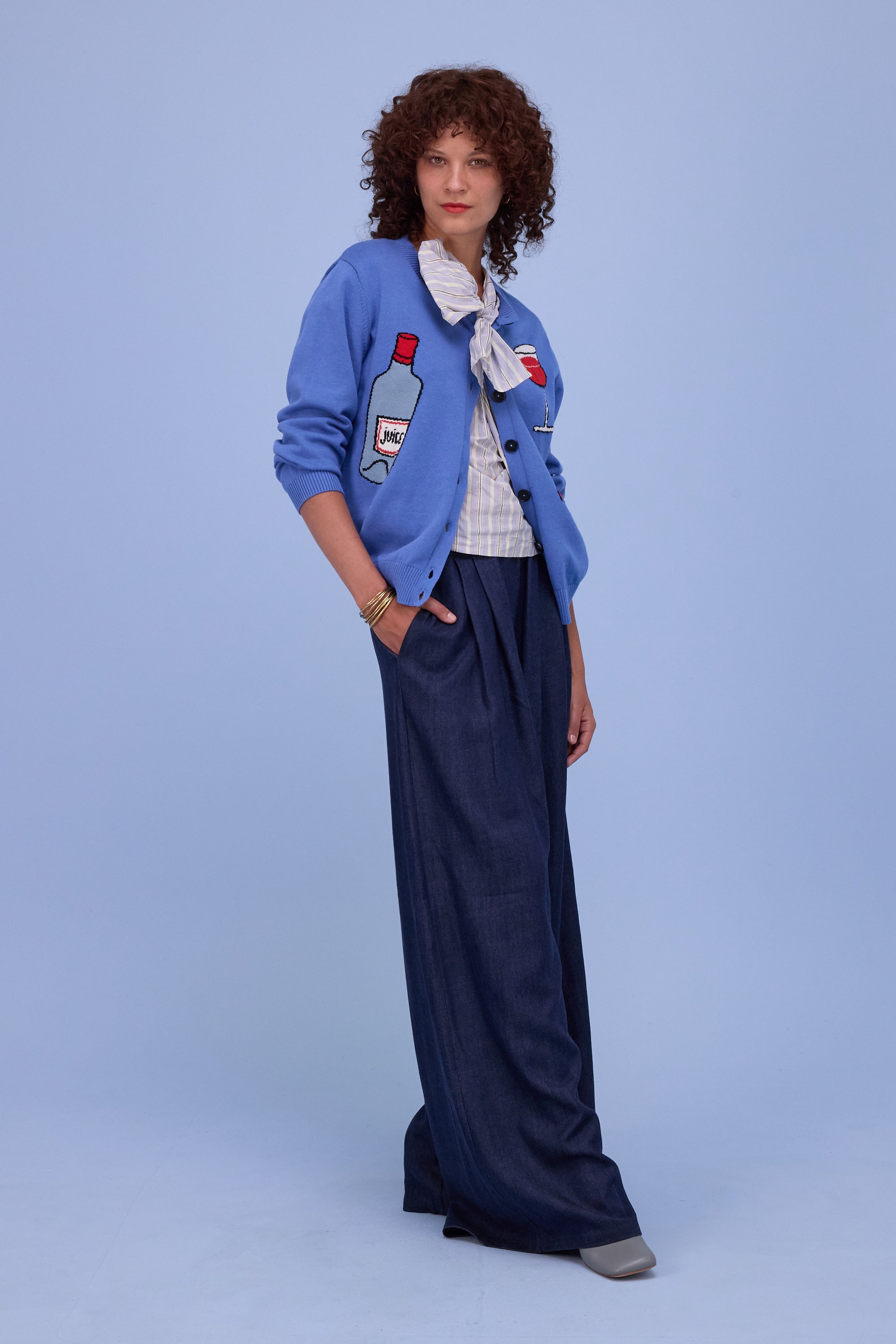 Hyères capture parfaitement l’esprit 'aperitivo' de la collection Printemps-Été 2026. Une bouteille, un verre et une brochette d’olives sont tricotés sur le devant. Tricoté en coton biologique et disponible en trois couleurs vives.
